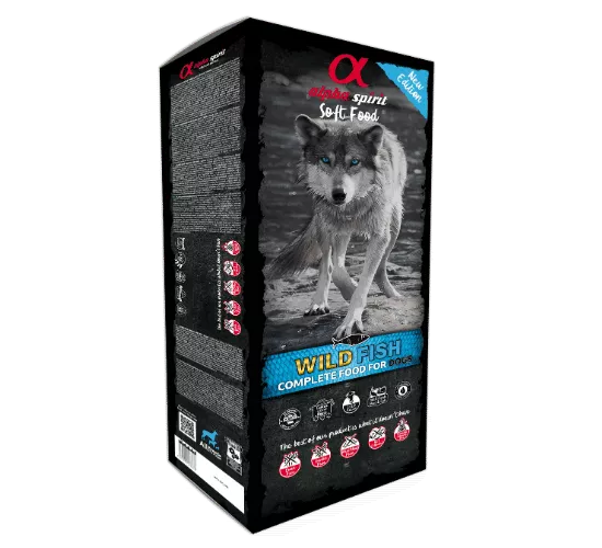 אלפא ספיריט מזון מלא חצי לח לכלבים. בסיס דגים 9 ק"ג 45 יחידות של 200גרם